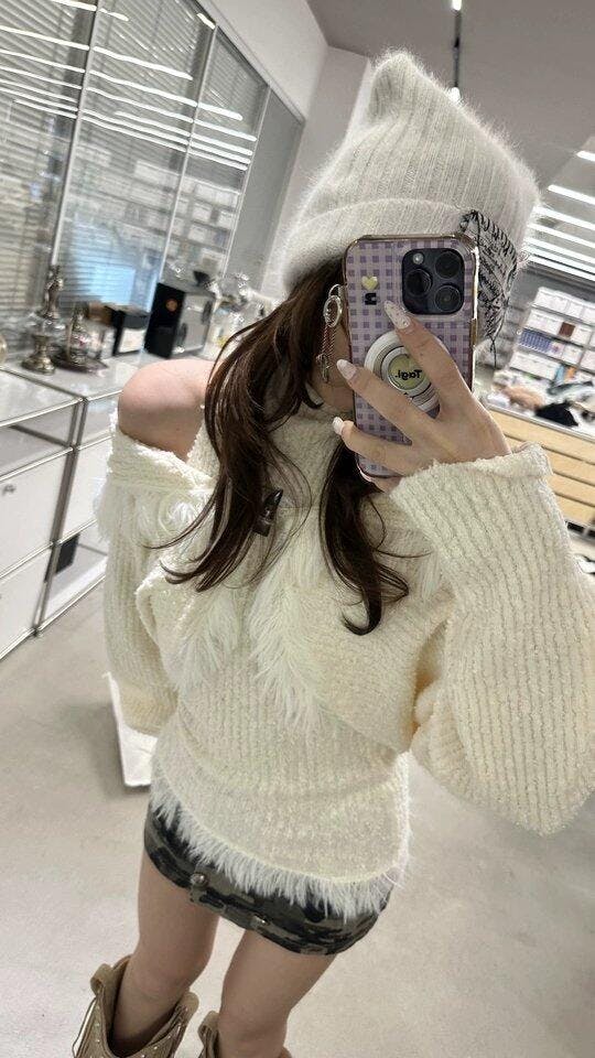 Two-piece knit set: a fitted racer-back vest with soft stretch and feather-trim detail, paired with a cropped hooded cape featuring horn-toggle accents. Plush knit texture adds comfort, creating a knit vest outfit and hooded feather-trim cardigan perfect for layered styling.