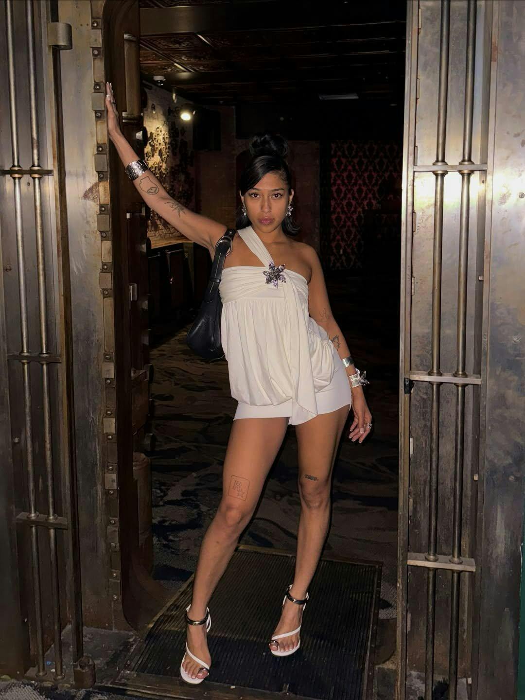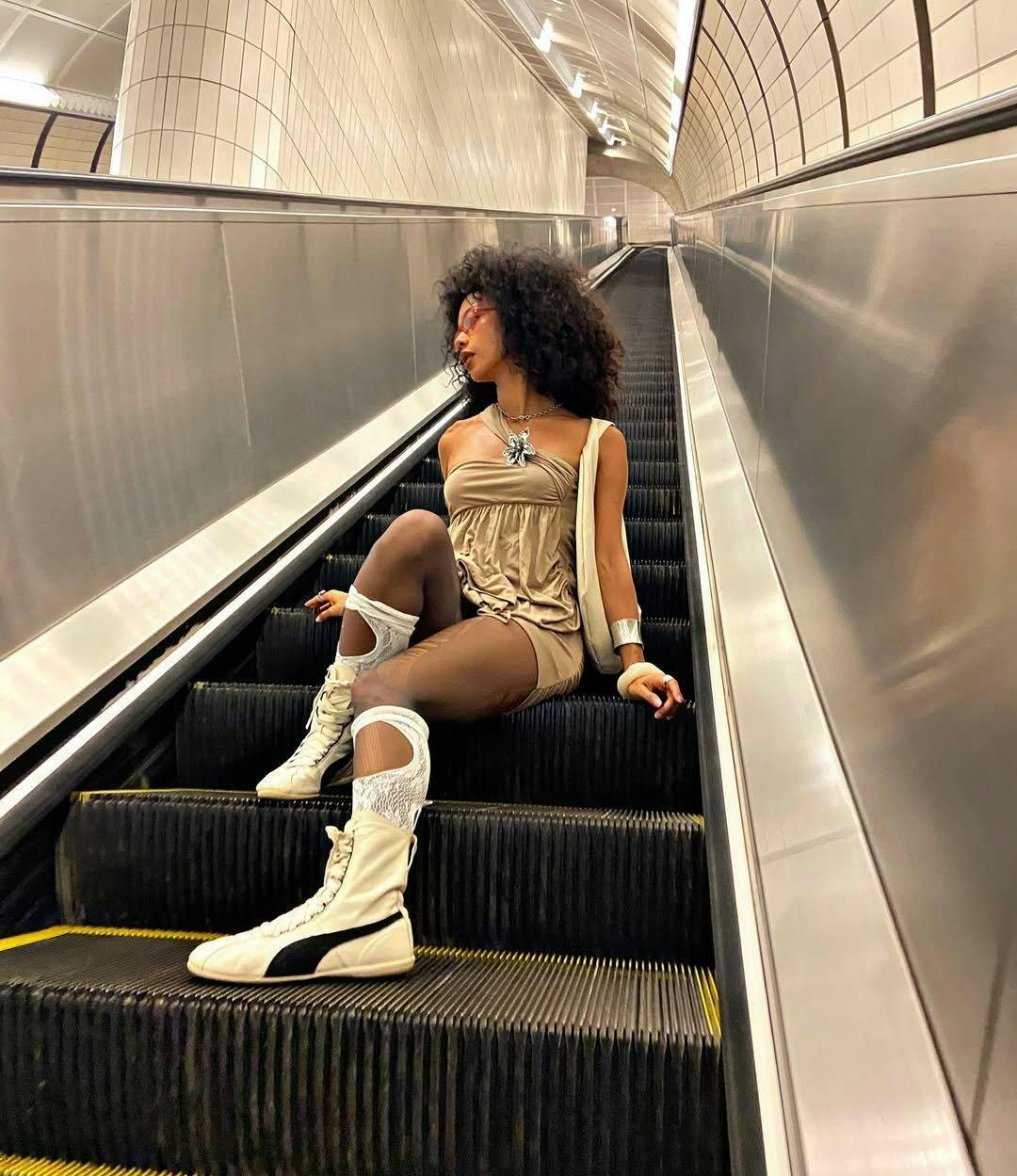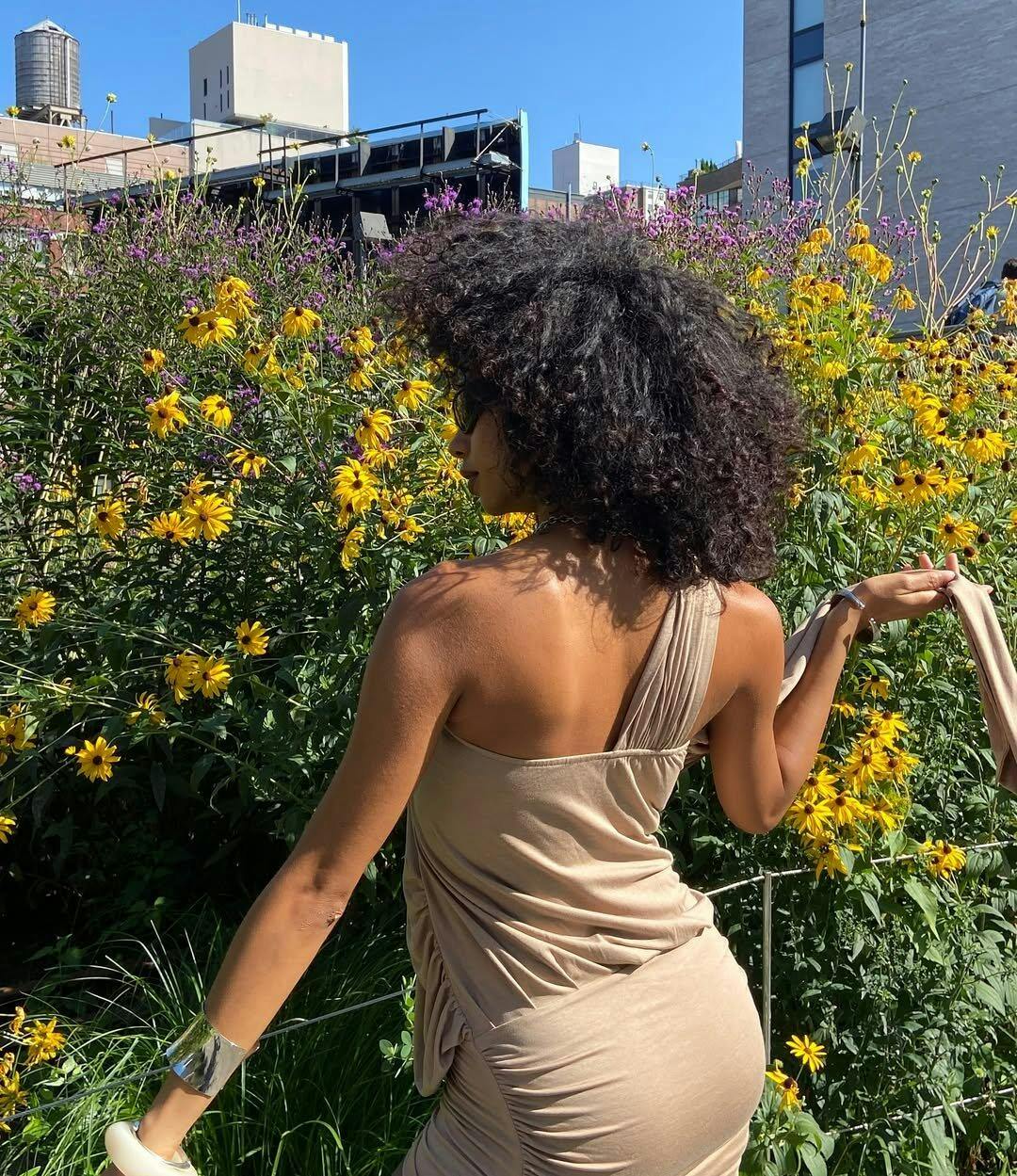 Shimmery acetate and sculptural folds—just add silver boots and a bold earring.