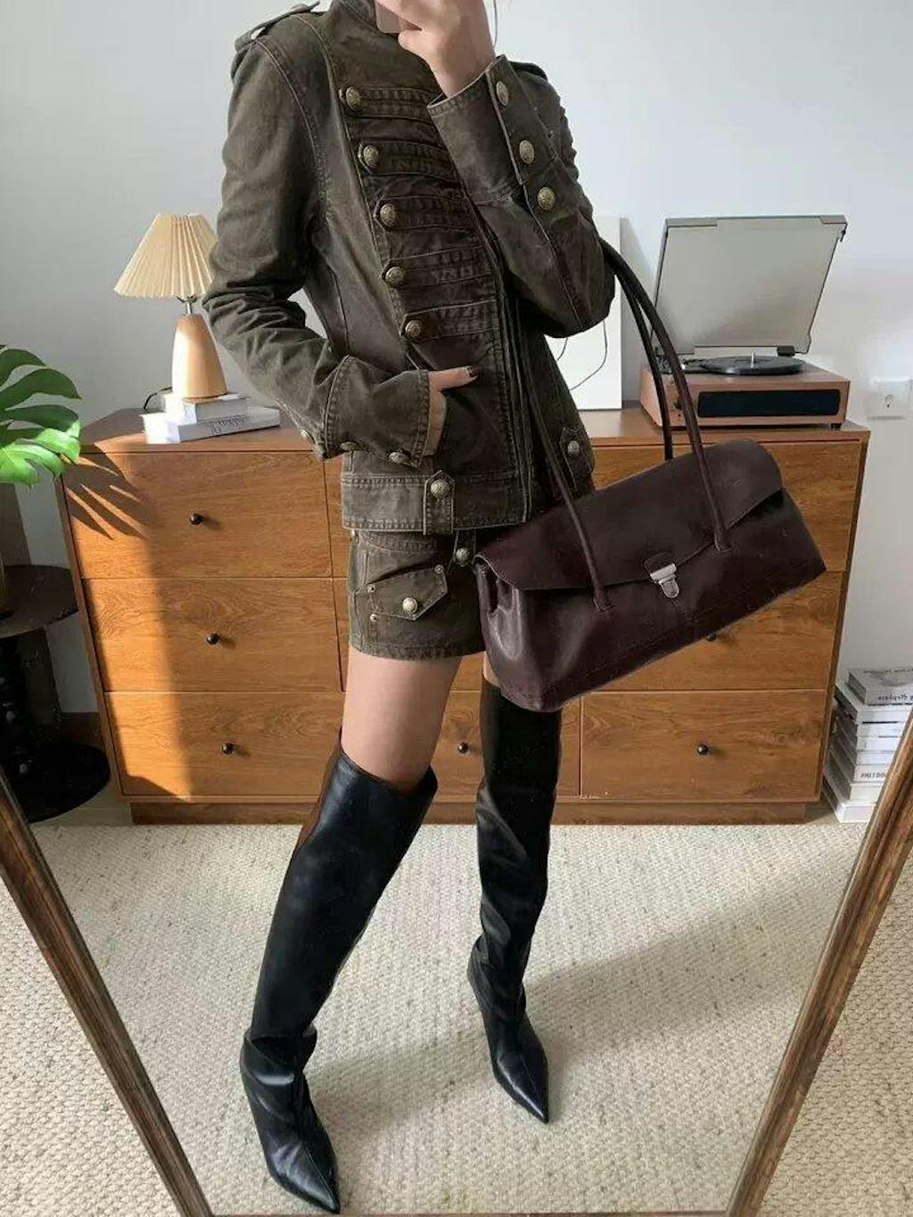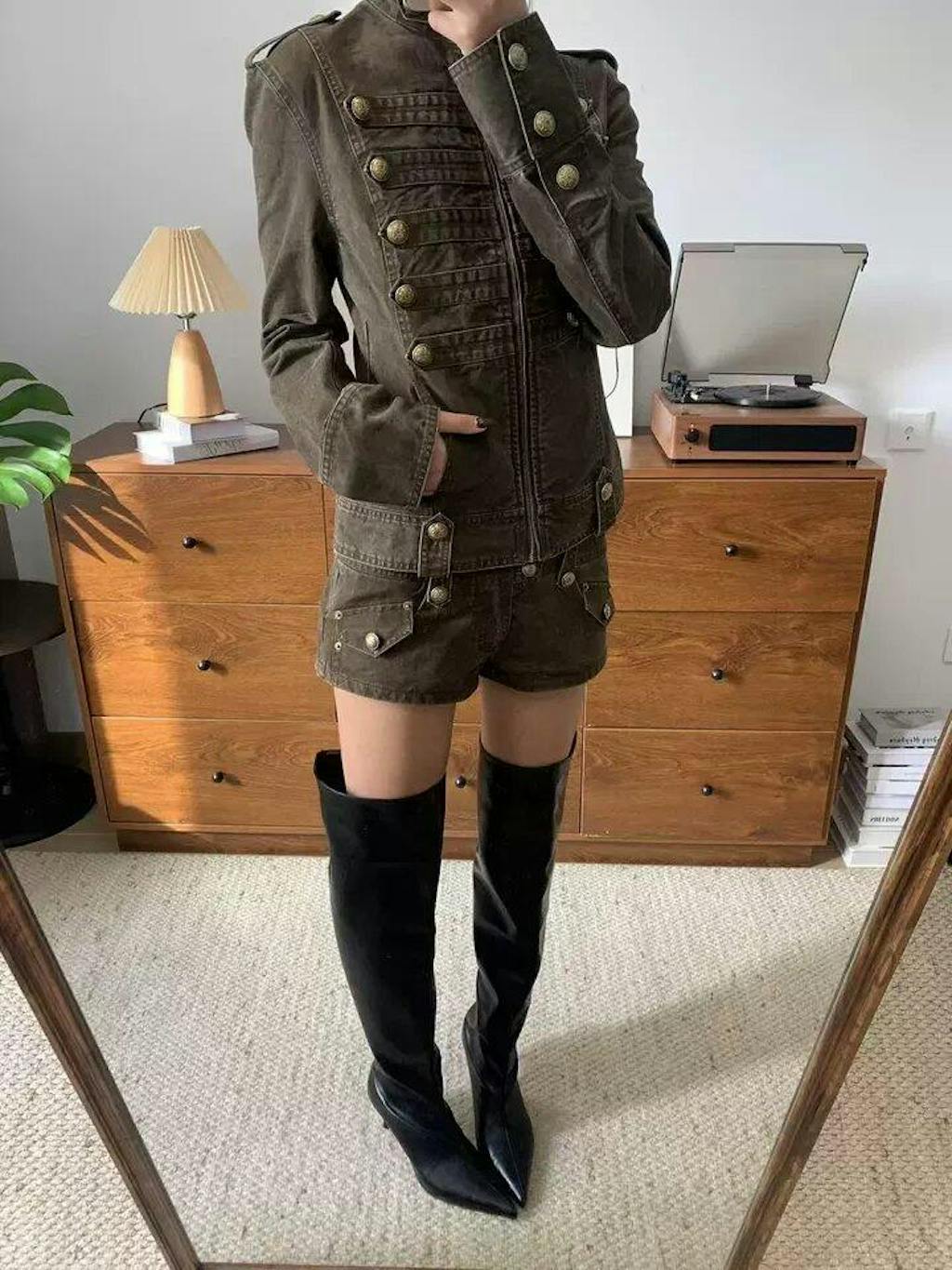 Fitted jacket napoleonic double-breasted metal buttons define a sharp military silhouette. Washed canvas adds a vintage patina. Blending leather with refined authority.